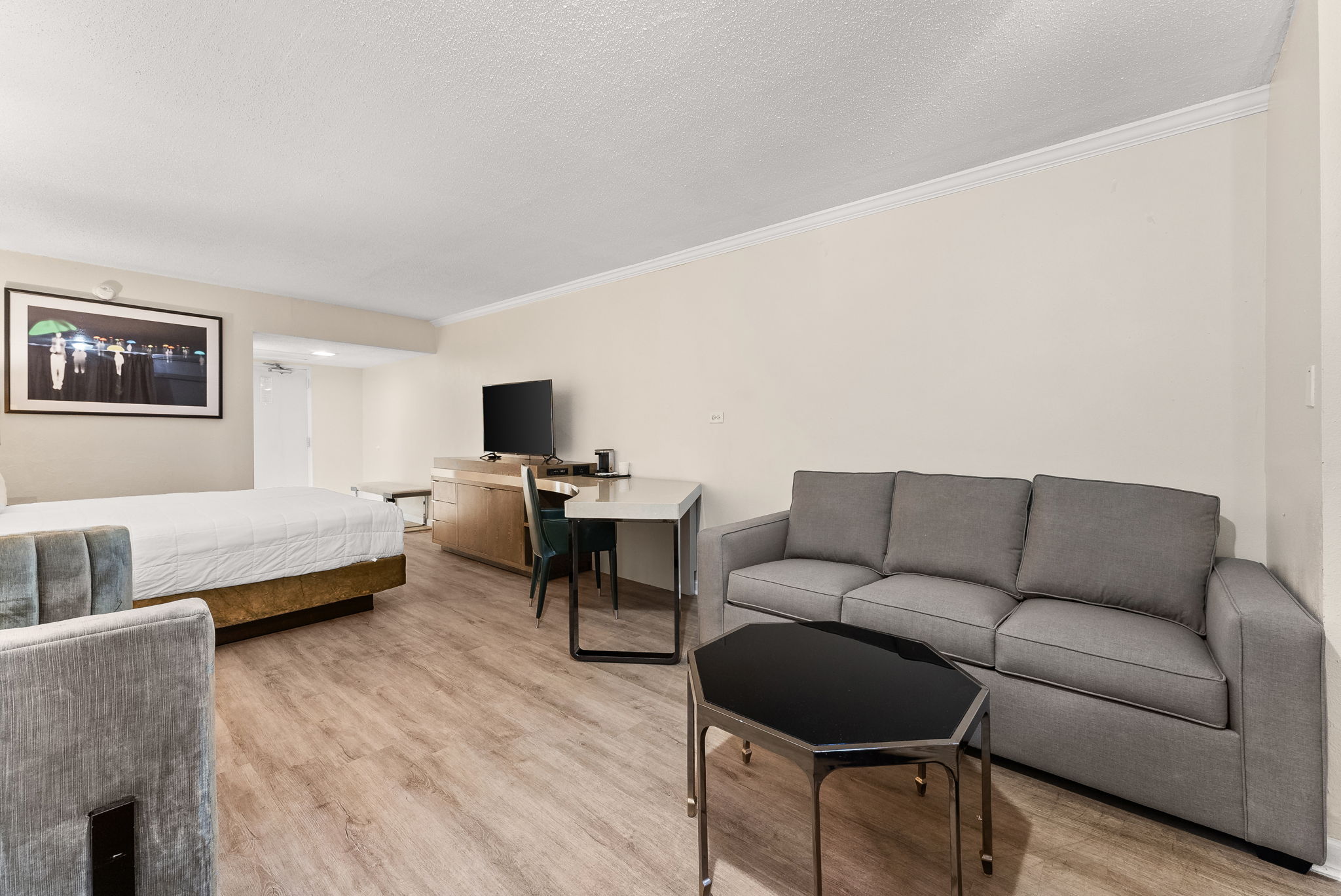 Enjoy a couple’s getaway or just watch the sun set while on your business trip. Gulf front room with a king bed and ocean view.